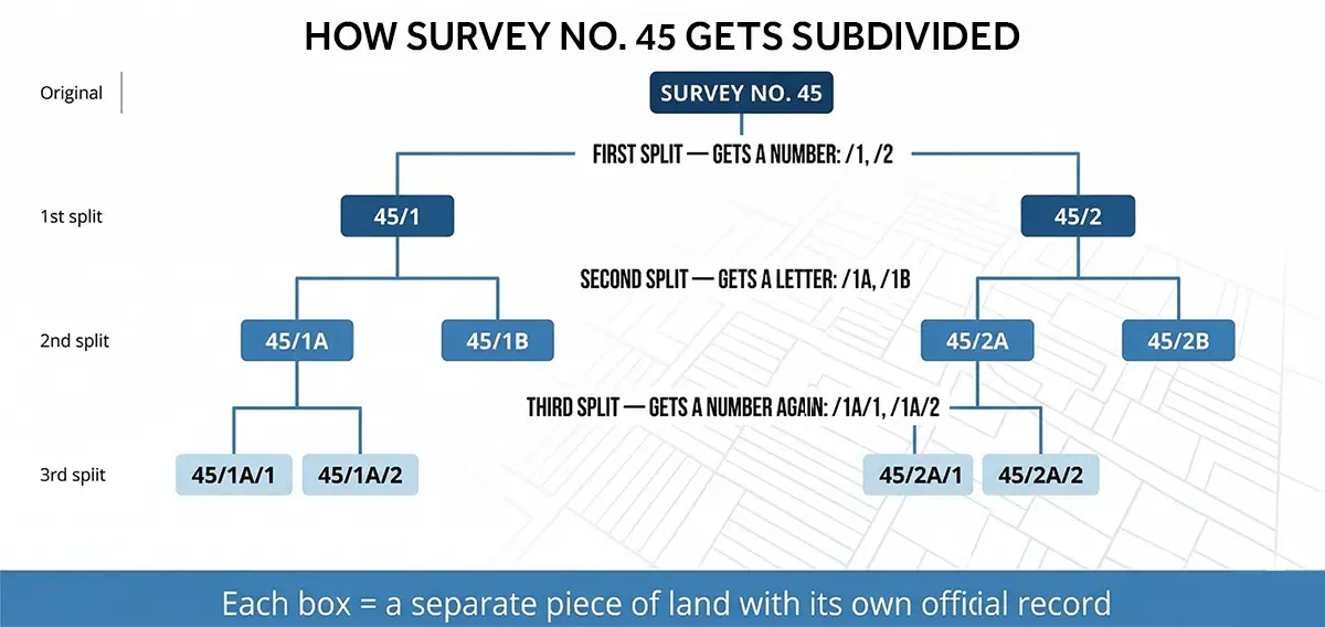 When land is partitioned due to sale, inheritance, court decree, or government acquisition, the survey number is subdivided. Each subdivision creates a new number derived from the parent. The original survey number is never deleted; it remains the root of all subsequent subdivisions.