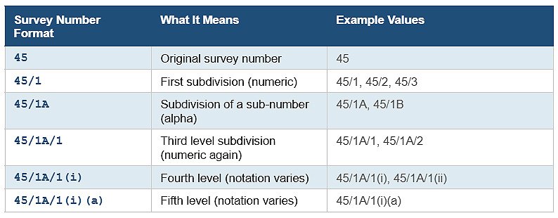 As a survey number is subdivided over time, its notation follows a consistent pattern. Here is what each part of the number means: