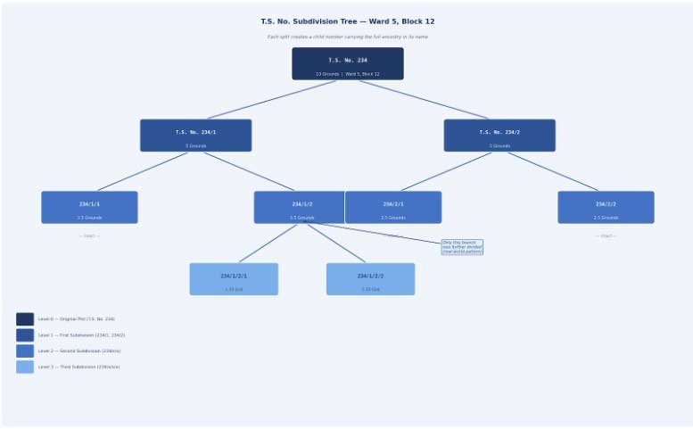 Within the urban TSLR world, land does not stay frozen. Families divide it, buyers buy pieces of it, and developers carve it up into layouts. Every time land is split, a new subdivision number is born, always carrying the history of its parent number in its name. A plot numbered 234/1/2/1 silently tells you its entire journey: it came from 234/1/2, which came from 234/1, which came from the original 234.