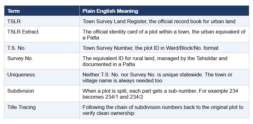 Think of it like how your home address works differently in a village compared to a city. Land records work the same way. Rural land gets a Survey Number. Urban land inside a town or city gets a Town Survey Number, and its official record is called the TSLR Extract.